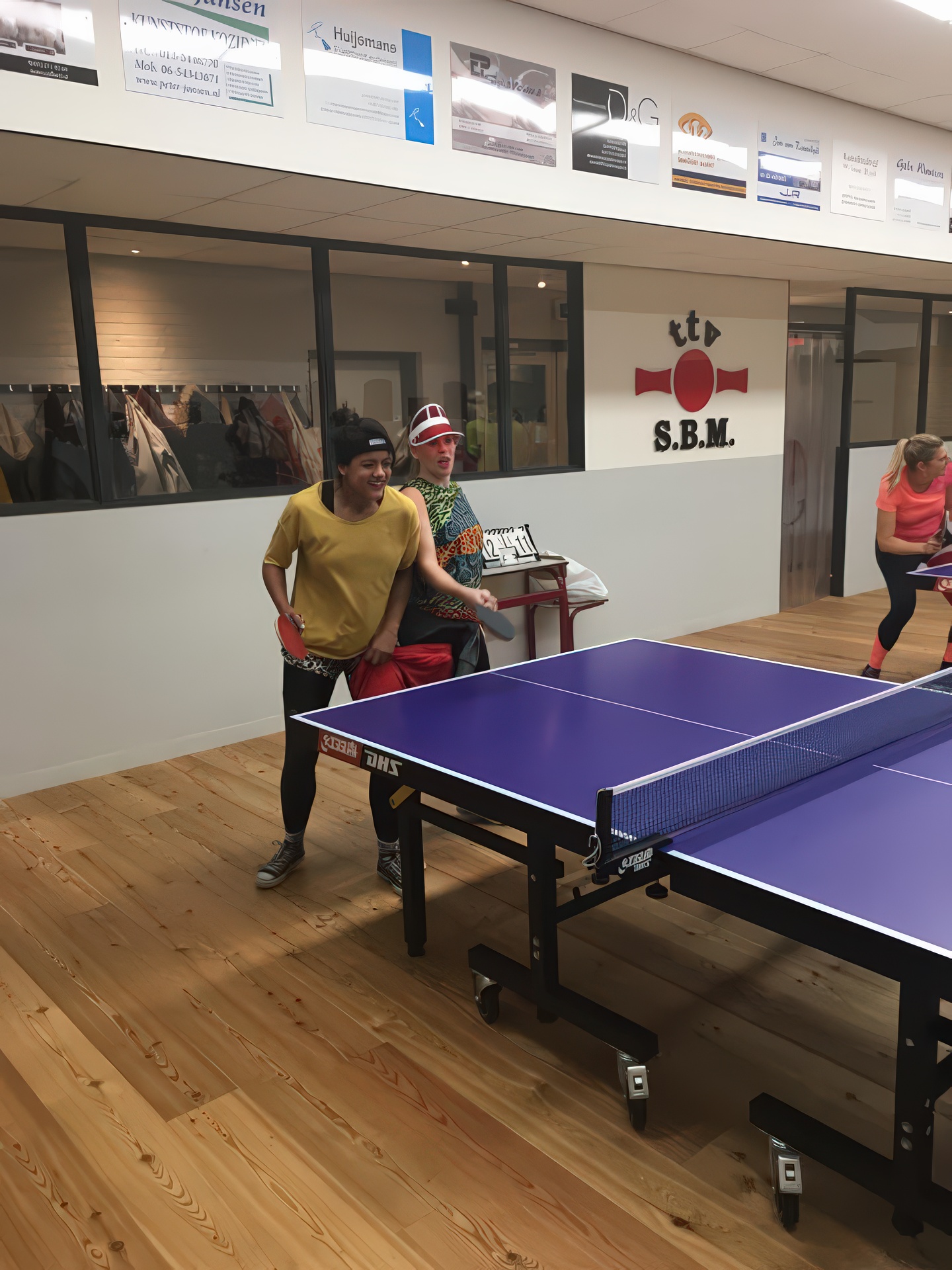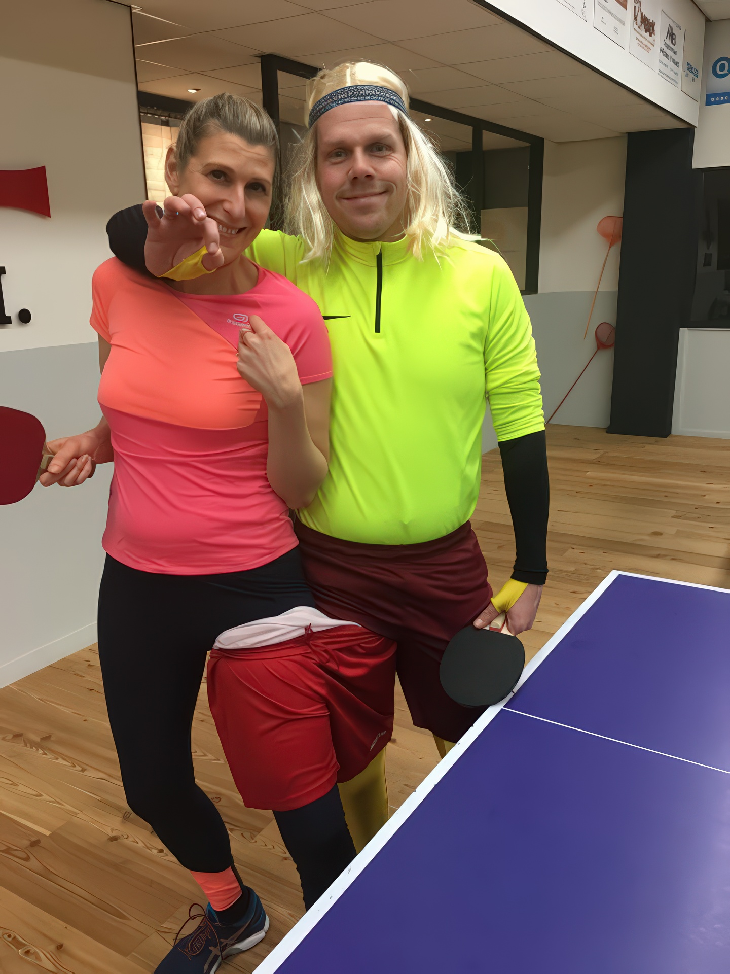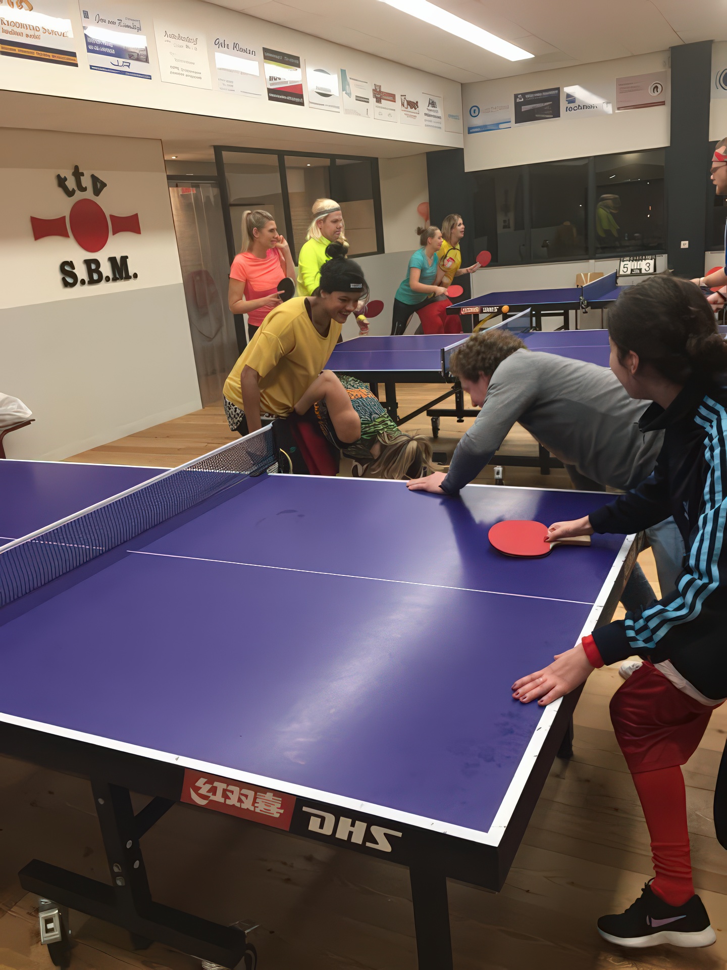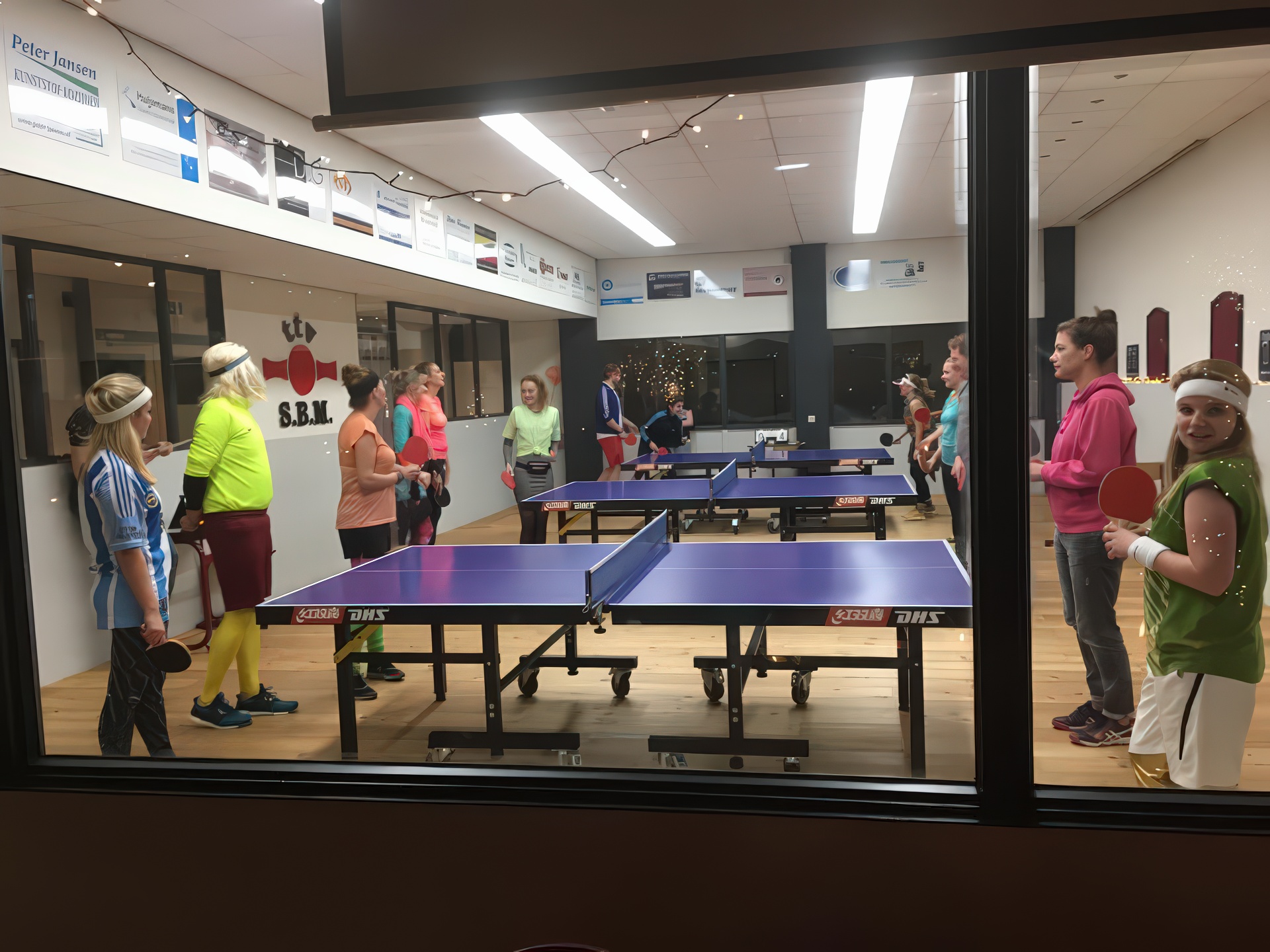 In 2018 kleurde onze speelzaal even niet rood-zwart, maar alle kleuren van de regenboog. Tijdens het inmiddels legendarische Carnavalstafeltennis werd er fanatiek gespeeld in de meest creatieve outfits. Van prinsen en piraten tot superhelden en compleet onherkenbare creaties – alles mocht, niets was te gek. Hoewel de rally’s soms nét iets minder serieus waren dan tijdens de competitie, werd er verrassend scherp gespeeld. Smashen met een cape, serveren met een steek op of een rally in volledige carnavalsoutfit: het leverde hilarische momenten én knappe punten op. Natuurlijk draaide het niet alleen om tafeltennis. Gezelligheid stond centraal. Tussen de wedstrijden door werd er gelachen, geproost en gefeest zoals alleen S.B.M. dat kan.